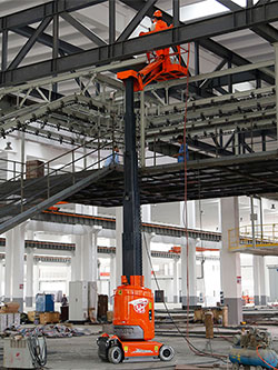 The Dingli AMWP11 is a self-propelled mast boom with a 11.2m working height and 3m working outreach. Mast booms are very popular with trades working in narrow aisles, such as for warehouse maintenance work and in supermarkets and other shops to reach over the top of racking/shelving.