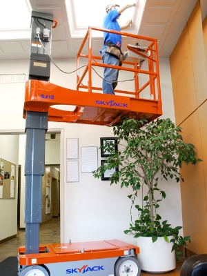 The Skyjack SJ12 offers 5.65m working height with a traversing platform providing 0.41m outreach. With platform retracted it is drivable at full height. The leightweight and compact dimensions allow the SJ12 to go into many elevators and into areas other platforms cannot access.