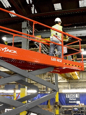 The Skyjack 4632 is a mid size electric scissor lift with a 11.75m working height and a 317kg safe working load. It is ideally suited for use indoors or outdoors on a wide range construction, installation and maintenance tasks such as electrical fixtures and cabling, ductwork, drywall, ceiling panels, overhead sprinklers, etc.