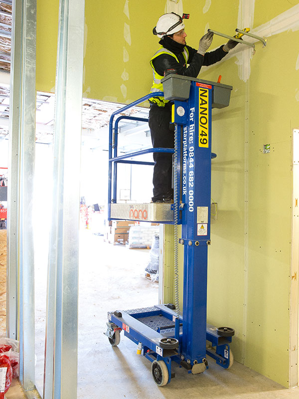 The Nano is a push around lift with a 4.50m working height and 200kg lifting capacity. The modern, lightweight and efficient alternative to aluminium towers, used for a variety of trades/applications such as interior fit-out contractors, electricians, ductwork installers, painters & decorators, etc. This machine elevates using battery power and needs to be pushed into position. It is not self-propelled.