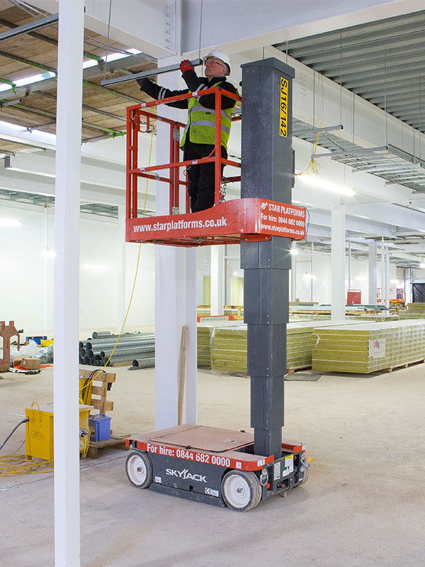 The Skyjack SJ16 is an electric lift with a 6.75m working height and 227kg lifting capacity. The modern, lightweight and efficient alternative to aluminium towers, used for a variety of trades/applications such as interior fit-out contractors, electricians, ductwork installers, painters & decorators, etc. This machine is self-propelled and drives and elevates using battery power.
