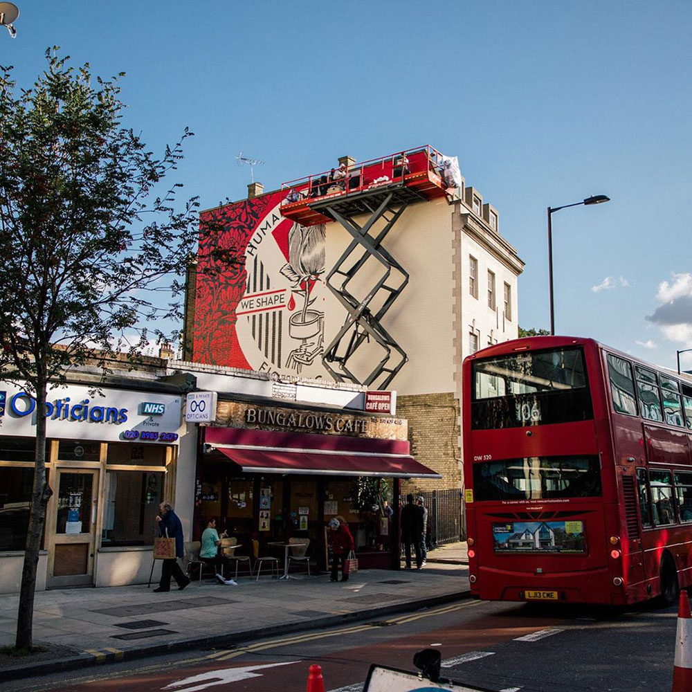 The PAINT (RED) SAVE LIVES campaign was the first global street art campaign of its kind and was brought together by thousands of different people to help bring urgent action in the fight to end AIDS. Wood Street Walls worked on the London arm of the campaign, and together with Shepard Fairey helped create the beautiful and eye-catching mural that now sits on Mare Street in Hackney, London.